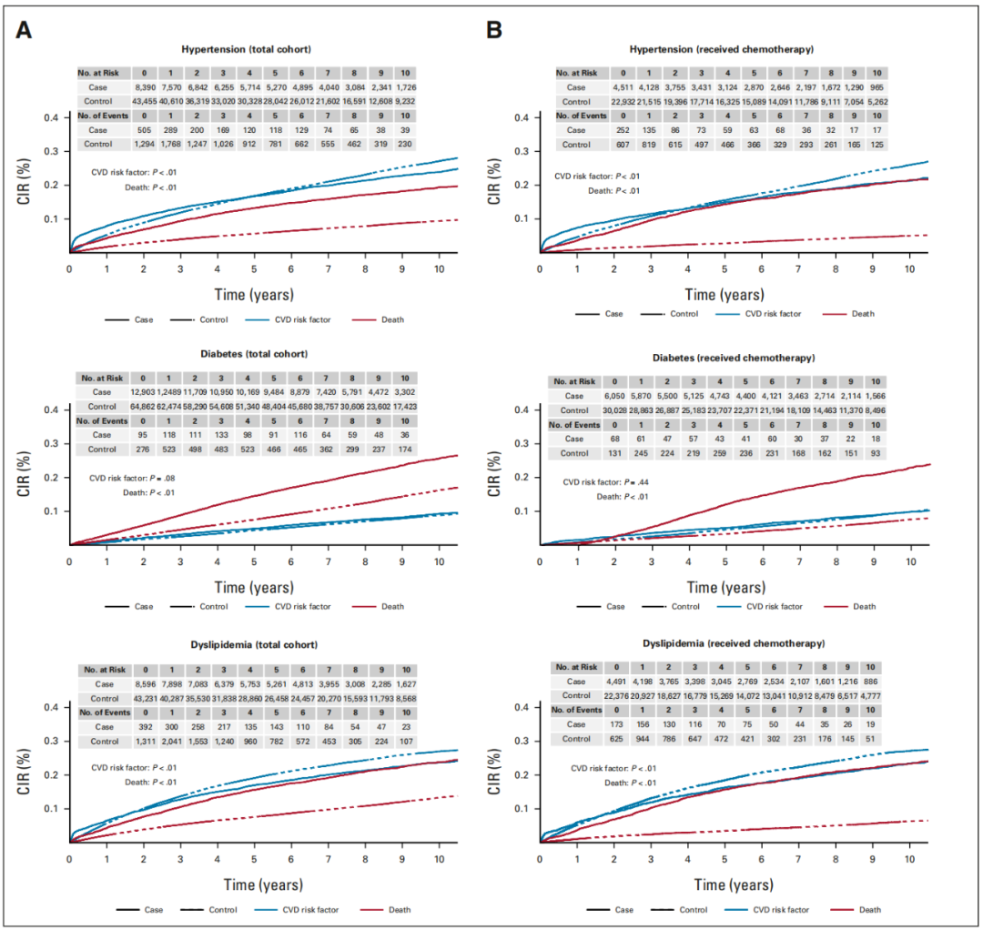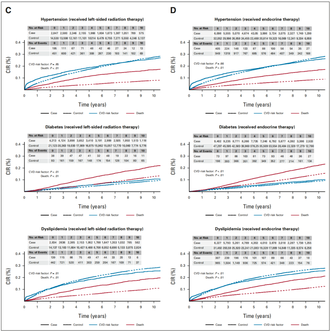 在该项研究中,研究者首先确定了2005年至2013年在北加州凯撒医疗机构(KPNC)诊断出的浸润性乳腺癌患者,并将其与出生年份、种族和民族的非癌症对照组按1:5进行匹配,估计高血压、糖尿病和血脂异常的累积发病率与总体死亡风险。亚分布风险比(sHRs)通过Fine和Gray回归估计,针对心血管疾病相关风险因素进行调整,并按治疗和体重指数(BMI)进行分层。
