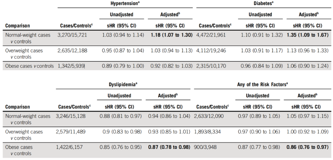 在按BMI类别分析的亚组中,与对照组相比,正常体重(BMI<24.9 kg/m2)的乳腺癌患者患高血压(sHR,1.18;95%CI:1.07~1.30)和糖尿病(sHR,1.35;95%CI:1.09~1.67)的风险显著增加(表2)。