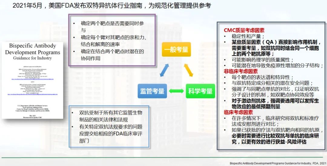 双抗药物的临床研究设计存在挑战,需规范化要求管理。2021年5月,美国FDA发布双特异抗体行业指南,为规范化管理提供参考。