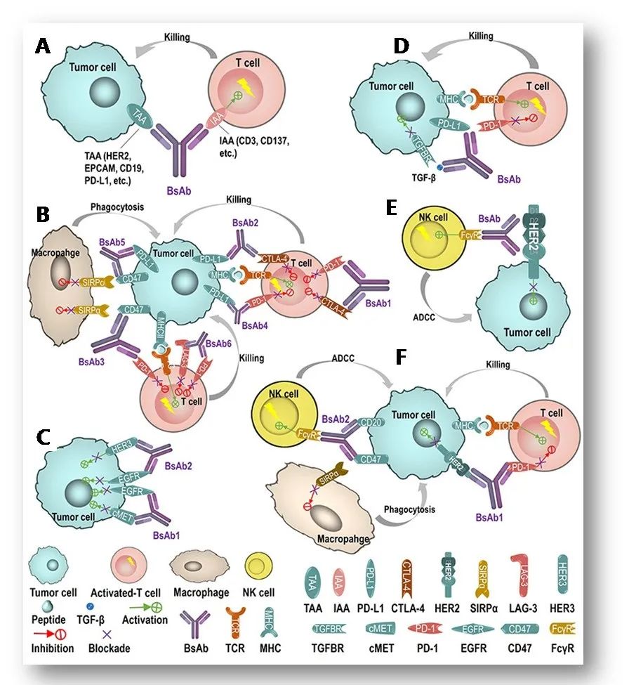 免疫治疗的研发成果显著改善了肺癌患者预后,多靶点联合治疗是免疫治疗进一步发展的潜在手段。与单克隆抗体相比,双抗药物增加了一个特异性抗原结合位点,因而特异性更强,可较准确地靶向肿瘤细胞并降低脱靶毒性。双特异性抗体的作用机制主要包括六类:①T细胞桥接型双抗(图A);②双免疫检查点阻断类双抗(图B);③双信号通路抑制类双抗(图C);④共定位阻断双抗(图D);⑤同抗原双表位双抗(图E);⑥肿瘤靶向性免疫调节性双抗(图F)。