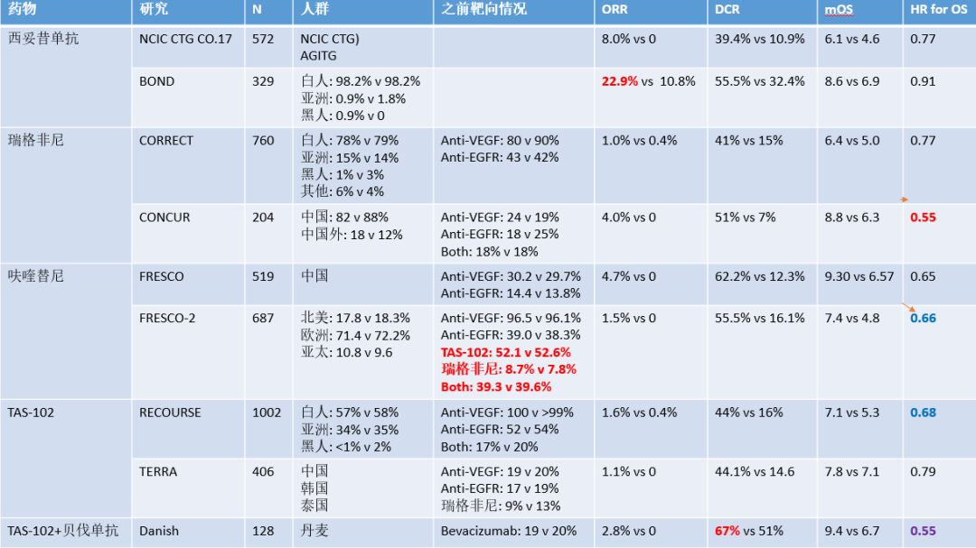 在晚期肠癌三线及后线治疗中,CSCO指南推荐瑞戈非尼、呋喹替尼或TAS-102单药为I级推荐方案。对于RAS/BRAF野生型且之前未行西妥昔单抗治疗的晚期肠癌患者,西妥昔单抗±伊利替康也是I级推荐方案。在突变患者中,根据以上单药对比安慰剂III期研究的OS-HR受益情况,瑞格非尼(CONCUR研究的OS-HR为0.55)可以首先考虑,但是临床很多时候大家反映手足综合症等毒性偏大,这时如何很好地平衡毒性和疗效是一门艺术。呋喹替尼凭借在FRESCO1&2研究(OS-HR分别是0.65和0.66)的优秀表现,结合毒性,可以作为三线乃至在TAS-102和瑞格非尼治疗进展的四线治疗选择。TAS-102+贝伐单抗对比TAS-102单药在DANISH研究中的OS-HR是0.55,生存受益可能高于上述单药,加之TAS102以血液学毒性为主的特点,TAS-102+贝伐单抗是我们很喜欢的方案。但是对比瑞格非尼和呋喹替尼,目前TAS-102仍未进入医保,费用阻止了很多患者对它的选择。而且DANISH还是一个II期研究。上述这些方案的有效率都在5%之下,对于有肿瘤相关症状需要缓解的患者,更高的有效率非常重要。西妥昔单抗联合伊立替康对比西妥昔单抗(BOND研究)虽然没有取得生存获益,但是西妥昔单抗联合伊立替康有效率可达23%,更有可能改善患者的肿瘤相关症状。