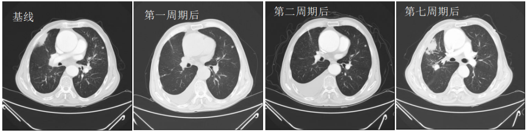 2022-05-19(第7周期治疗后)胸部CT:右肺占位复查,较前稍增大;纵隔及右肺门肿大淋巴结,大部分较前增大,双侧胸腔积液,两肺多个结节,考虑转移可能性大。2022-05-26完善CT引导下肺穿刺活检,病理为治疗后肿瘤性坏死,疗效综合评估:SD。