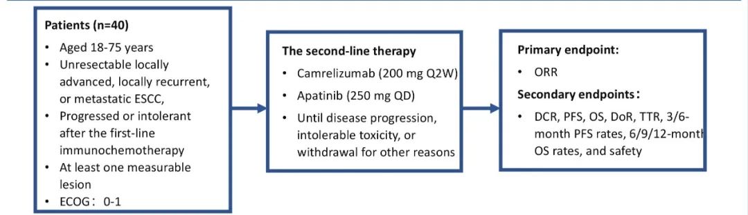队列2纳入了18-75岁不可切除的局部晚期、复发或转移性ESCC患者,ECOG PS评分为0-1分,在一线免疫联合化疗治疗中进展或不耐受。在一线治疗期间,至少有3个月的疾病稳定或缓解状态。患者接受卡瑞利珠单抗(200mg Q2W)联合阿帕替尼治疗(250mg QD),直到疾病进展、无法耐受的毒性或因其他原因结束治疗。主要研究终点为客观缓解率(ORR)。次要研究终点包括疾病控制率、无进展生存期(PFS)、缓解持续时间、至缓解时间、OS、3/6个月PFS率、6/9/12个月OS率和安全性。