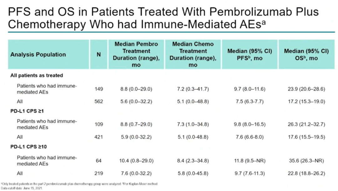 晚期实体瘤免疫治疗PROs数据的荟萃分析已证实ICI与其它药物的联合不影响患者的生活质量,那么免疫介导的不良反应是否会影响患者的疗效及生存?本次会议报道,KEYNOTE-355中发生免疫相关不良反应患者的中位PFS和OS优于整体人群,在PD-L1 CPS≥10组中,出现免疫介导不良事件患者的中位OS长达35个月,不良事件主要集中在甲状腺功能异常,联合组甲减发生率高达15.8%。