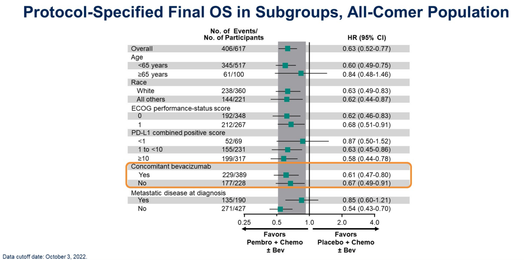 吴令英教授:这次KEYNOTE-826研究报告了最终OS结果,我们可以看到最终的OS和PFS与既往IA1结果保持一致,总体人群、CPS≥1、CPS≥10的患者是有较为明确的生存获益;但CPS<1的患者样本较小,仅占总体人群的11%,作者也没有过多地分析这部分人群的数据,但在亚组森林图显示OS(HR 0.87)和PFS(HR 0.95)获益有限。