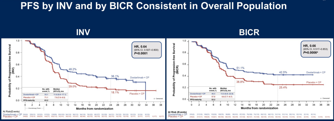 吴令英教授:子宫癌(包括宫内膜癌、宫颈癌)的免疫治疗超越了卵巢癌,因为在子宫癌患者中,PD-L1高表达、dMMR/MSI-H的发生率比较高。我们知道基于KEYNOTE-158研究,帕博利珠单抗已经用于携带dMMR/MSI-H的晚期实体瘤患者二线治疗;1/2期GARNET试验则使多塔利单抗获得dMMR/MSI-H子宫内膜癌二线治疗适应症。3期RUBY研究,则是在一线化疗(卡铂+紫衫)的基础上联合多塔利单抗,即CP+PD-1的三药联合方案。今年初发表于NEJM的数据显示,CP+PD-1可较CP显著改善总体人群研究者评估(INV)的PFS(HR 0.64,P<0.0001)和OS(HR 0.64,P=0.021),dMMR/MSI-H人群的进展风险则显著降低72%(HR 0.28,P<0.0001)。这次ASCO报道了盲法独立中心评估(BICR)的数据,显示与INV数据一致。