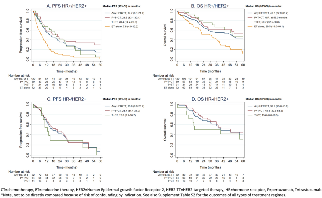 几项观察性研究表明,与HR-/HER2+患者相比,HR+/HER2+患者预后更好[4-7]。研究发现,随着帕妥珠单抗和T-DM1的加入,改善了HR-/HER2+ABC患者的总生存期(OS);但并未改善HR+/HER2+的OS(与帕妥珠单抗和T-DM1加入前相比)[7]。这可能与一线及后续全身治疗相关,但研究较少。这项研究分析了患者HR状态及前四线的全身治疗,以及患者的肿瘤特征、无进展生存期(PFS)和OS。