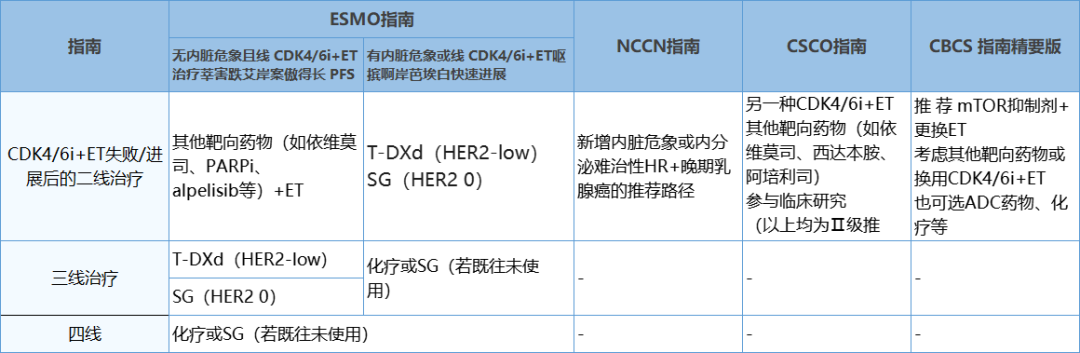国内外指南对HR+/HER2乳腺癌一线CDK4/6i+ET进展后的治疗推荐