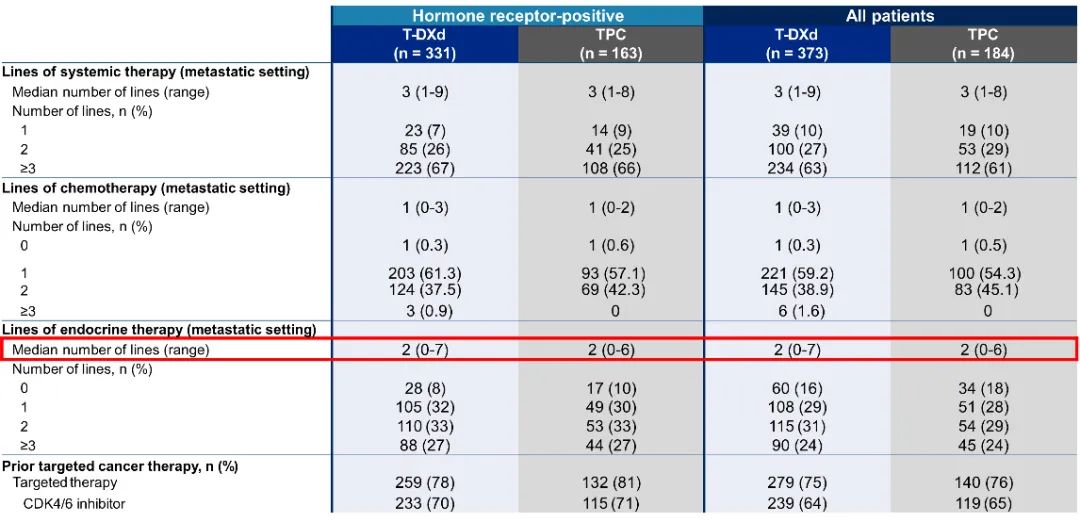 传统分子病理学中的HER2阴性人群既包括IHC 0也包括IHC1+和IHC2+/FISH-。随着T-DXdⅢ期临床研究DESTINY-Breast04阳性结果的公布,其中HER2 IHC1+和IHC2+/FISH-被重新定义为了HER2低表达。据流行病学数据显示,在HR+人群中有50~60%的患者存在HER2低表达[21,22],提示有很大一部分HR+晚期乳腺癌患者能够从新型ADC药物的治疗中取得获益。DESTINY-Breast04研究[23]纳入了557例HER2低表达晚期乳腺癌患者,按2:1随机分为德曲妥珠单抗组(T-DXd,n=373)和医生选择的化疗组(TPC,n=184),其中HR+HER2低表达晚期乳腺癌患者共494例(T-DXd n=331,TPC n=163),结果显示HR+乳腺癌人群中,T-DXd组较TPC组mPFS(10.1个月vs 5.4个月)和mOS(23.9个月vs 17.5个月)均有统计学和临床显著改善。安全性方面,T-DXd组≥3级不良事件发生率为52.6%,其中最常见的为中性粒细胞减少,发生率13.7%;化疗组≥3级不良事件发生率为67.4%,中性粒细胞减少发生率为40.7%。研究方案中要求HR+患者为内分泌难治性人群,定义为至少接受过一种内分泌治疗且研究者判定患者不再从内分泌治疗中获益。进一步分析实际入组HR+人群的基线特征:中位治疗线序为3线,其中ET经治线序为2线,既往靶向治疗比例>75%,CDK4/6i经治比例70%。提示对于两线ET+经治后的HR+/HER2低表达晚期乳腺癌,转换不依赖内分泌通路的治疗手段,T-DXd较化疗可以带来更好的获益。