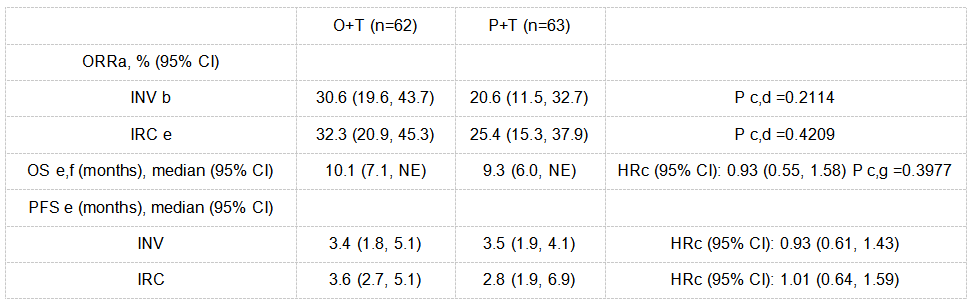 As of 1 Feb 2023, 125 pts (median age 64 years; 88.8% male) were randomized to O+T (n=62) or P+T (n=63). INV-assessed ORR was 30.6% with O+T vs. 20.6% with P+T; hazard ratio (HR) of INV-assessed PFS was 0.93 (95% CI: 0.61, 1.43) (Table). Incidence of pts with ≥1 any adverse event (AE) was comparable between O+T (93.5%) and P+T (95.2%); most common AE was anemia (O+T: 25.8%; P+T: 28.6%). Respective AE rates for O+T and P+T were 41.9% and 41.3% grade ≥3 AEs, 41.9% and 39.7% serious AEs, 9.7% and 15.9% AEs that led to treatment discontinuation, 45.2% and 30.2% immune-related AEs, and 0% and 3.2% treatment-related fatal AEs. Table: 1020MO