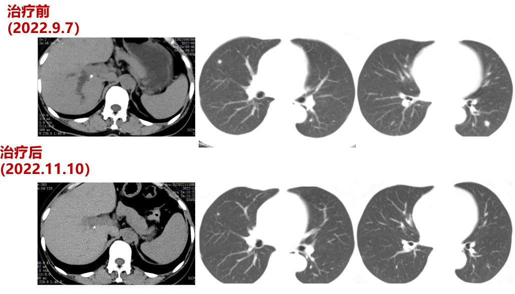 于2023-8-17行“肝脏肿物射频消融术”。于2023-8-29始给予患者贝伐+TAS-102治疗2周期,至今仍在治疗中。