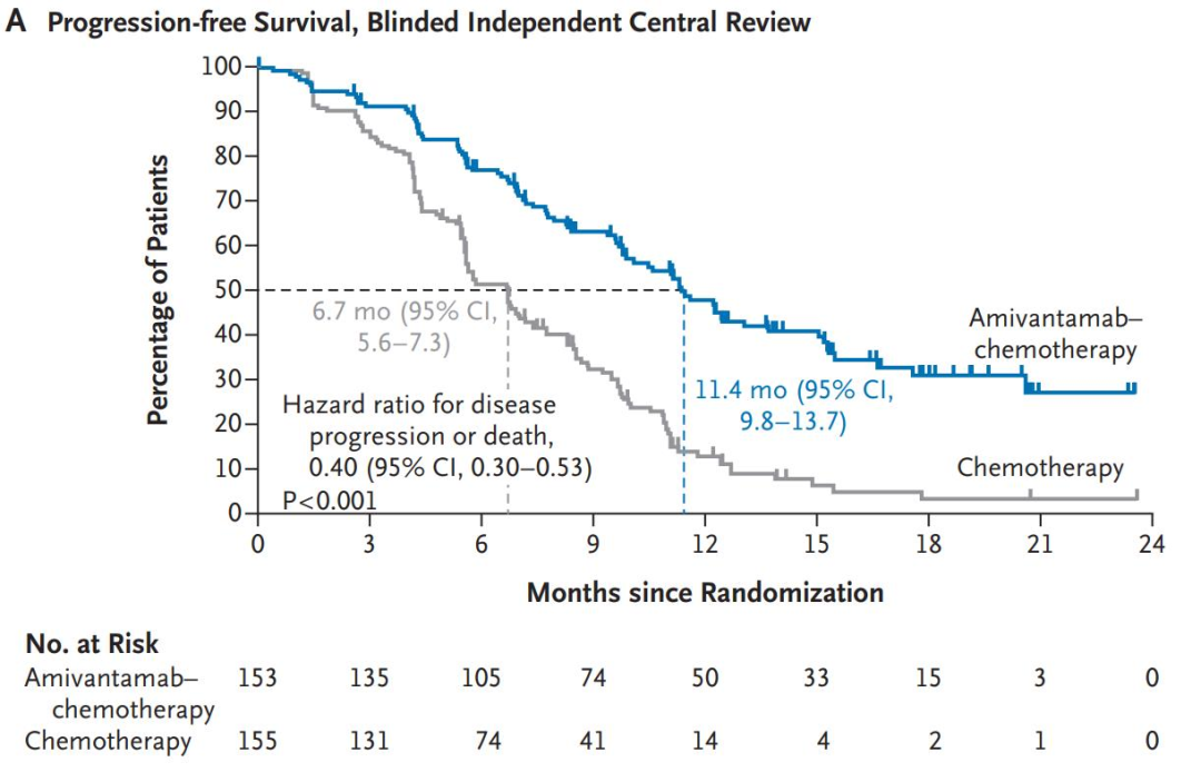 研究结果:从2020年12月至2022年11月,共计542例患者接受筛查,308例患者随机,联合Amivantamab治疗和单纯化疗组分别入组153例和155例患者。两组患者基线特点均衡可比,分别有92%和8%的患者基于组织及外周血检测结果入组。中位随访时间14.9个月,中位治疗持续时间分别为9.7个月和6.7个月。数据分析时,两组分别有46%和15%的患者仍然接受研究药物治疗。66%的化疗组患者交叉及接受Amivantamab治疗。