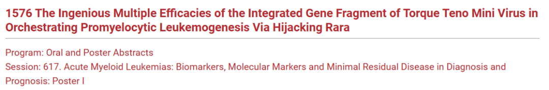 编者按:第65届美国血液学会(ASH)年会日前在美国圣迭戈(San Diego)圆满召开。作为全球血液学领域规模最大、涵盖最全面的国际学术盛会之一,吸引了来自世界各地的知名专家学者,分享、交流血液学疾病最新基础前沿、新治疗手段及方案、疾病管理策略等。在本次大会上,北京陆道培血液病研究院、陆道培医院刘红星教授团队领导的一项多中心研究入选壁报展示,该研究首次对TTMV::RARA-急性早幼粒细胞白血病(APL)的分子机制和临床特征进行了系统报道。