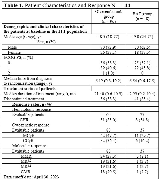 研究简介:该研究是一项多中心、随机II期临床试验,旨在评估奥雷巴替尼(Olverembatinib)vs现有最佳治疗(BAT)在对3种TKIs(伊马替尼、达沙替尼[D]和尼洛替尼[N])耐药和/或不耐受的慢粒慢性期(CML-CP)患者中的有效性和安全性。主要研究终点为无事件生存期(EFS)、全因死亡率、复发率、治疗失败率等。截至2023年4月30日,纳入144例患者,其中奥雷巴替尼组96例,BAT组48例。中位年龄49岁,129例(89.6%)既往接受过至少3种TKIs(I、D、N)治疗。15例(10.5%)伴T315I突变的患者既往接受过至少1种TKIs治疗,其中9例(6.3%)接受过2种TKIs治疗。