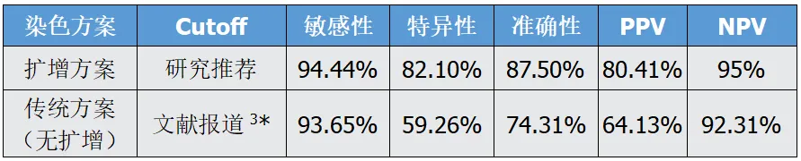 推荐cut-off值的敏感性和特异性均高于此前文献报道的cut-off值(≥1%):敏感性和特异性分别为94.44%vs.87.9%和82.1%vs.81.1%[4]