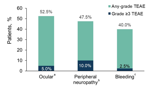 在整个队列中,85.0%的患者至少有1次治疗相关不良事件(TRAE)。25.0%的患者发生≥3级TRAE,其中最常见的是周围神经病变事件(12.5%)。针对眼部、周围神经病变和出血事件预先指定了特别关注的不良事件,分别发生21例(52.5%)、19例(47.5%)和15例(37.5%)患者(图3)。计划更新疗效和安全性数据。