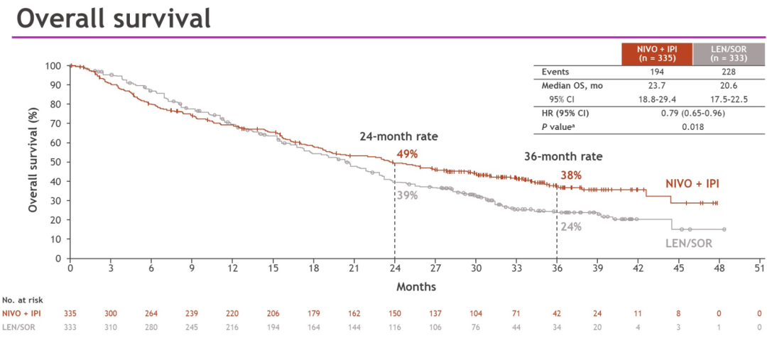 研究人群的基线特征均衡。约1/3患者存在HBV感染;约3/4患者为BCLC C期,即肝癌晚期。纳武利尤单抗联合伊匹木单抗组的中位OS为23.7个月(而对照组OS为20.6个月,HR=0.79,P=0.018);并且随着时间推移,两组的生存曲线区分愈加明显,治疗组的2年OS率接近50%(对照组39%)。